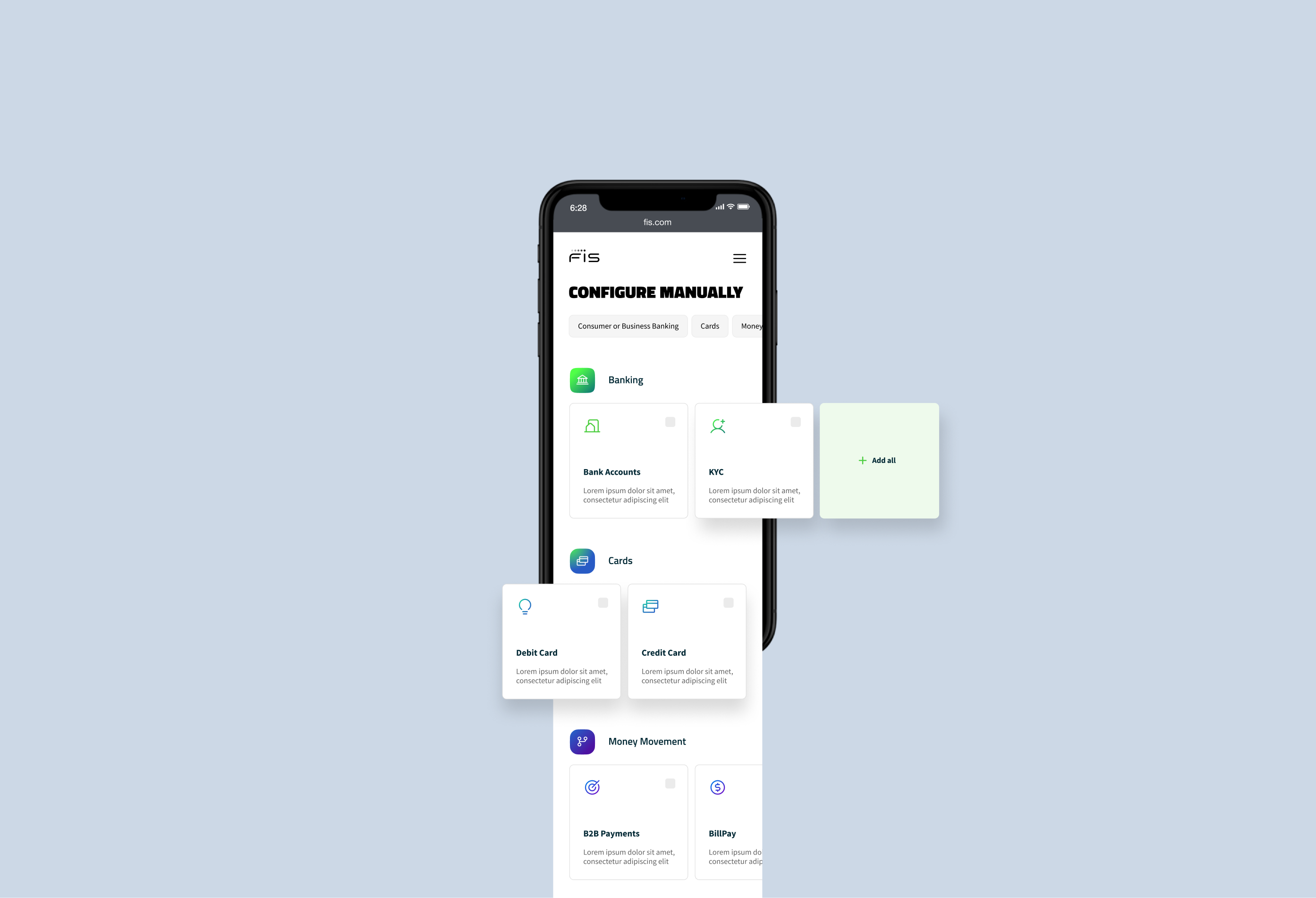 FIS is a company that creates tailor-made banking solutions. Our mission here was to prepare a simple fintech product where users can build a banking system by choosing the functionalities they want to have.