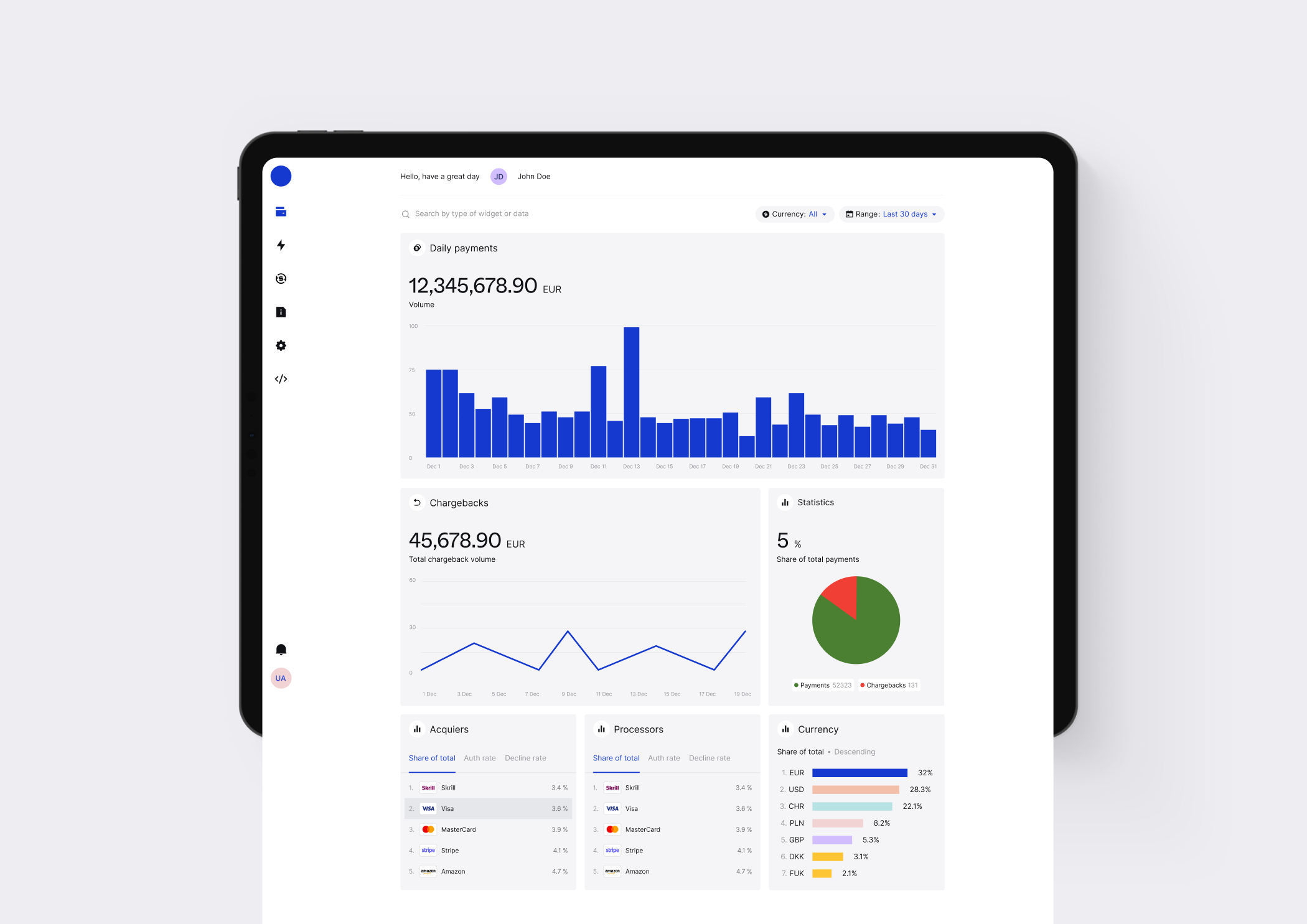 To make things simpler, on the dashboard, we put metrics like daily payments, chargebacks, and other statistics that can help identify the direction of business.