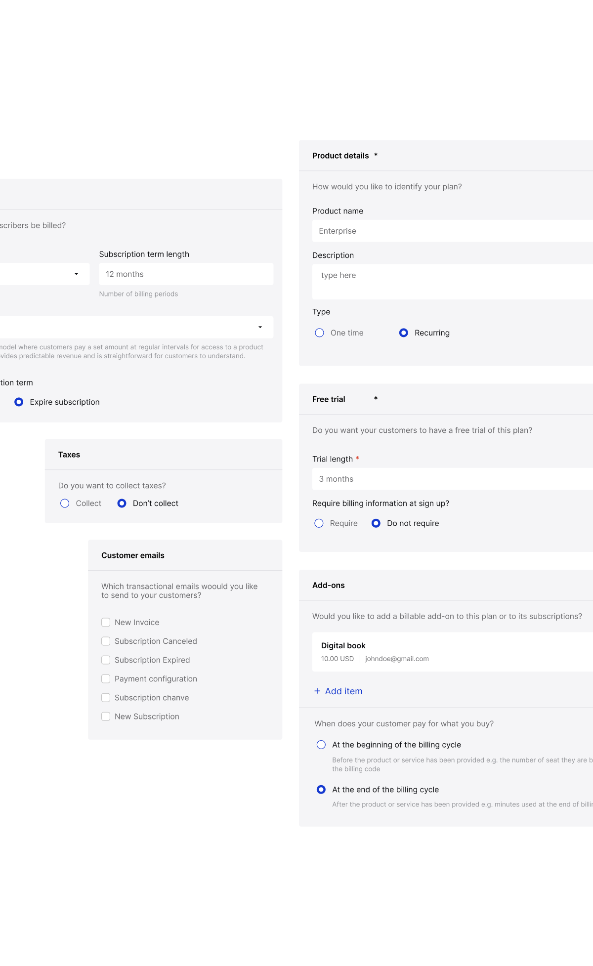 Jillion can help users create subscriptions and as well manage all payments from an active contract. The creation wizard lets users create any subscription from scratch. Users can add a free trial, setup fee, currencies, taxes, add-ons, and many more. Users can also setup a custom pricing.