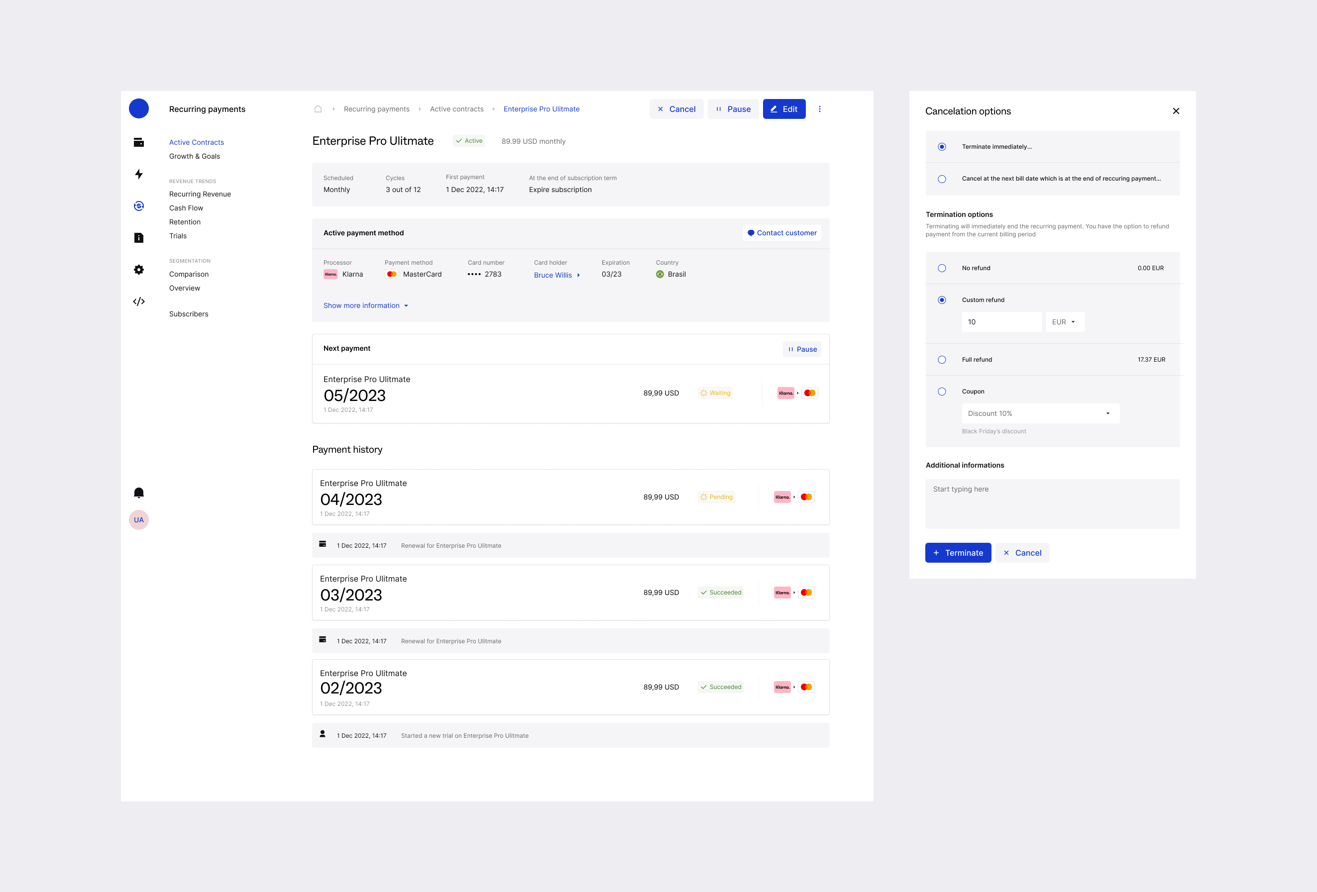 After building subscriptions and launching them, subscriptions that get bought land inside active contracts. This place lets users manage all ongoing payments for each subscription. Canceling and refunding are only a small portion of functionalities.