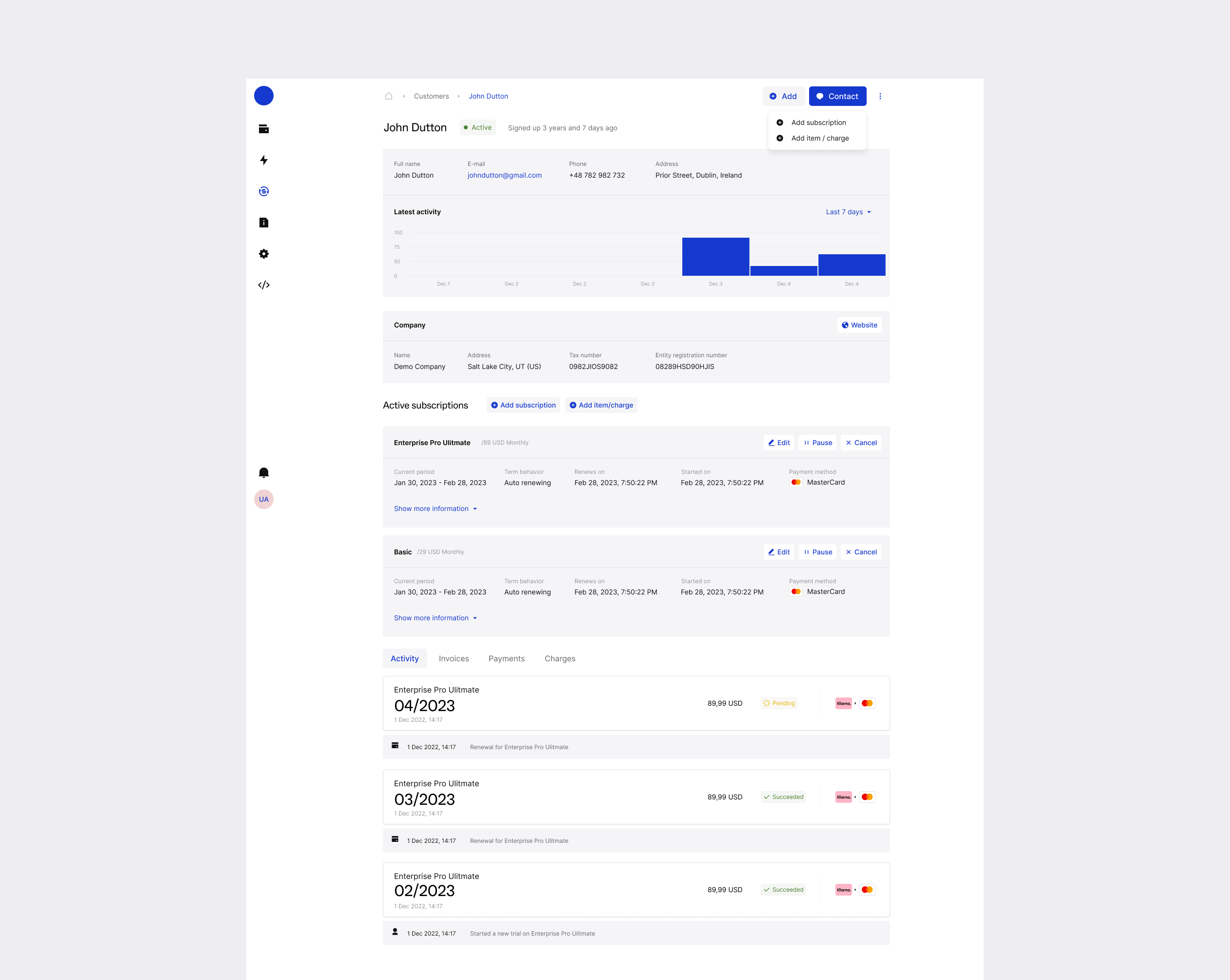 Every payment is made by the customer. Users at Jillion can edit details, and add / remove / change subscriptions. Add a one-off charge, create an invoice, or even set custom pricing for any product.