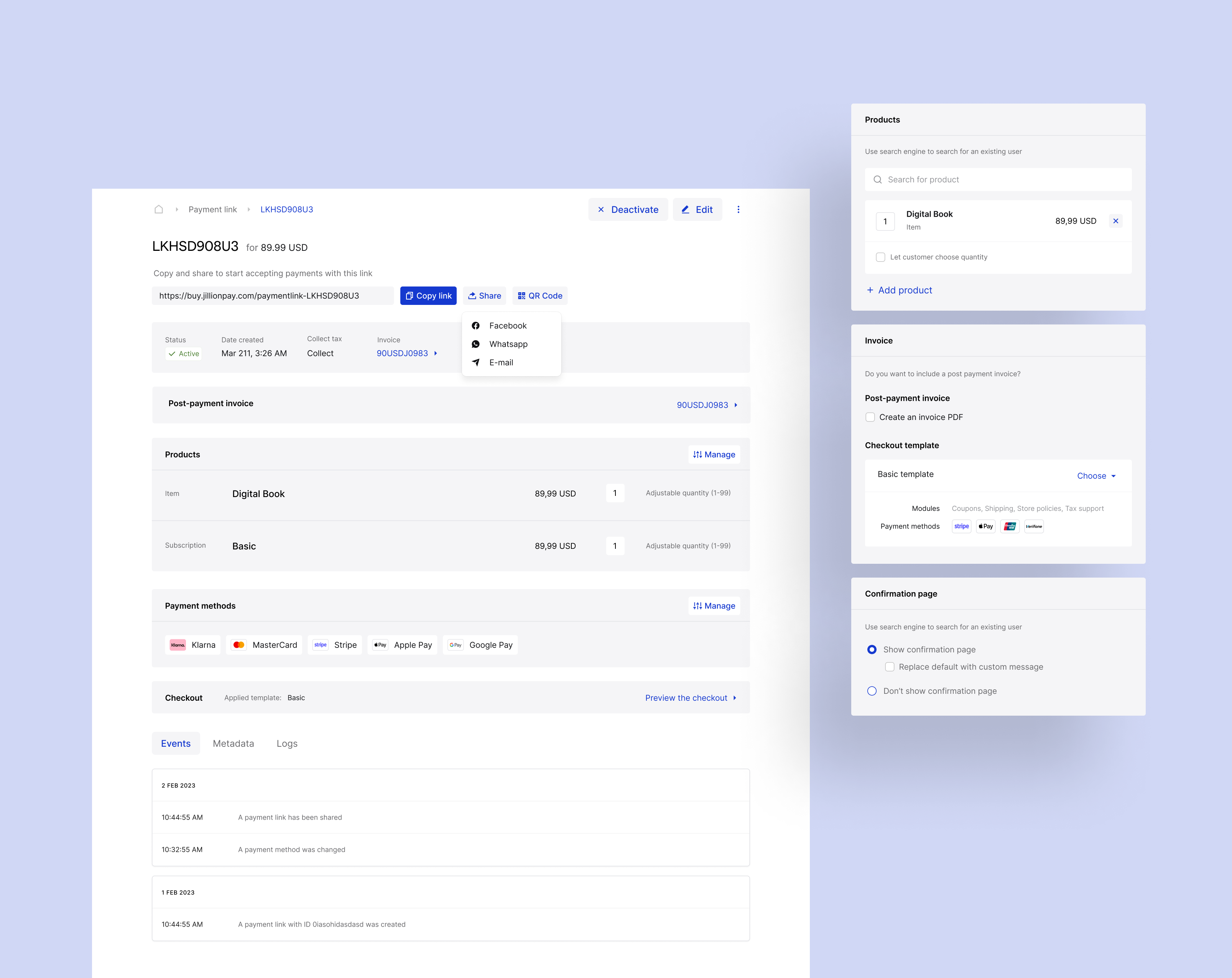 To each payment link users can choose Checkout Template. They give the options to choose available payment methods, modules like customer data, coupons, or privacy sections. A little bit of branding is also possible.